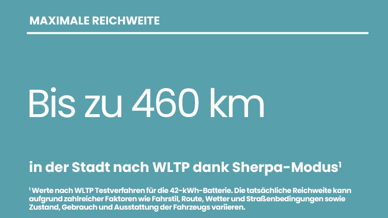 ** Werte nach WLTP Testverfahren. Die tatsächliche Reichweite kann aufgrund zahlreicher Faktoren wie Fahrstil, Route, Wetter und Straßenbedingungen sowie Zustand, Gebrauch und Ausstattung des Fahrzeugs variieren.