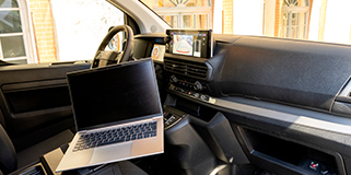 L'un des nombreux avantages de la nouvelle modularité de Scudo est qu'elle permet de transformer votre cabine en bureau mobile grâce à la tablette intégrée dans le dossier de la banquette.
