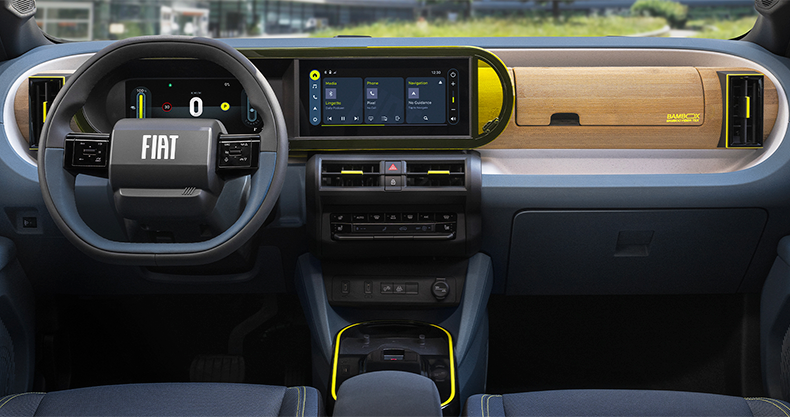 Lo stile italiano e FIAT si riflette anche nella grafica del quadro strumenti digitale da 10 pollici e del monitor da 10,25 pollici del sistema di infotainment. La cornice che circonda entrambi i display ricorda il leggendario circuito di prova sul tetto dell'ex stabilimento FIAT nel quartiere Lingotto di Torino, incluso il panda in miniatura nella curva.
